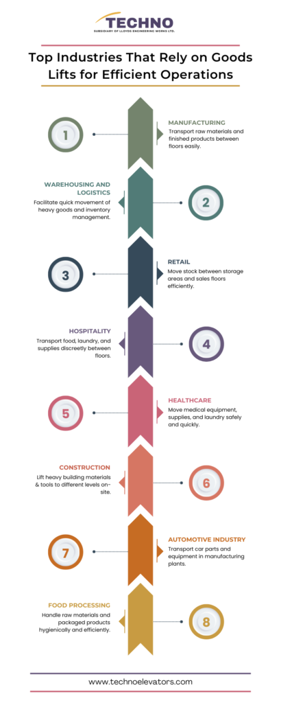From manufacturing to hospitality, goods lifts play a crucial role in streamlining operations across various industries. This infographic highlights the top sectors where goods lifts are essential for productivity, safety, and smooth logistics.