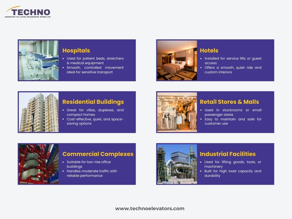 • Public infrastructure: These lifts will work well in bus depots, railway stations, and airports where frequent access is required.